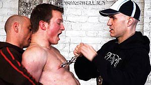 We beat him up before giving him a very harsh thrashing and riding the big brute like a horse. Then we rip open his virgin arse, get him working on our dicks, clamp his dick and nips and cover him in piss.