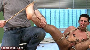 The dumb lad soon regrets it, as he's stripped naked, thrashed and made to endure humiliating sexual torments.